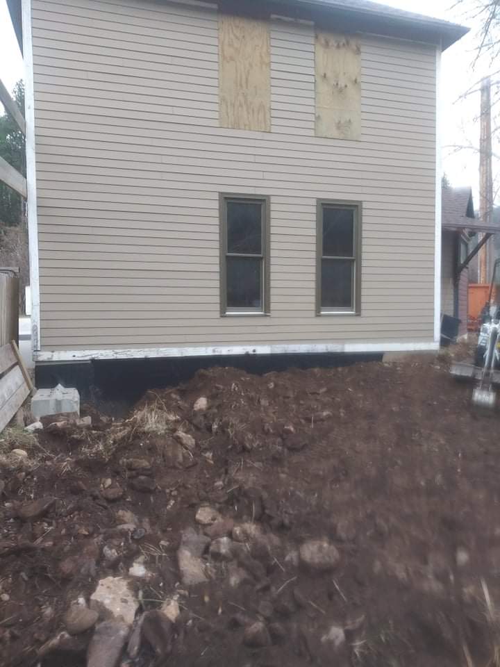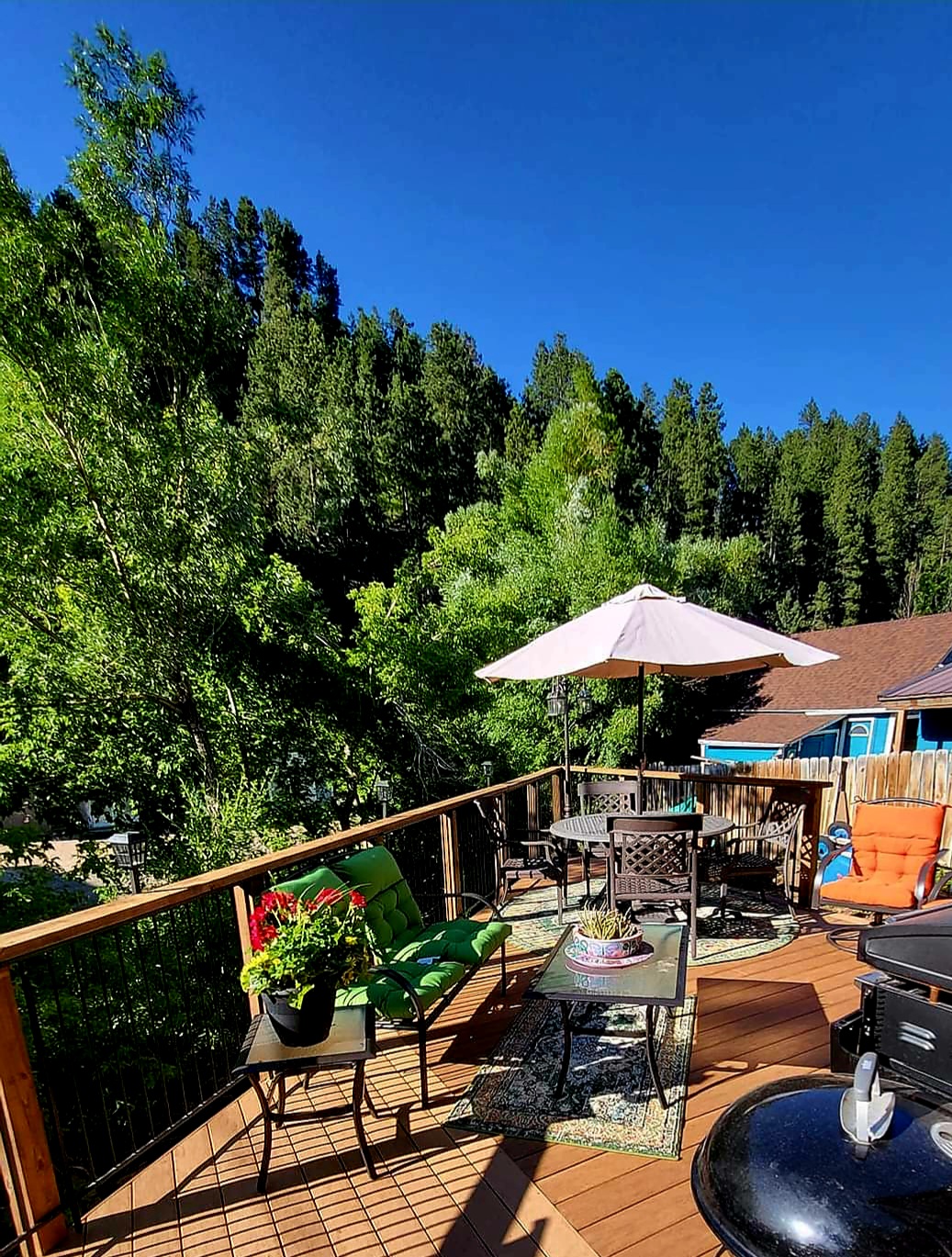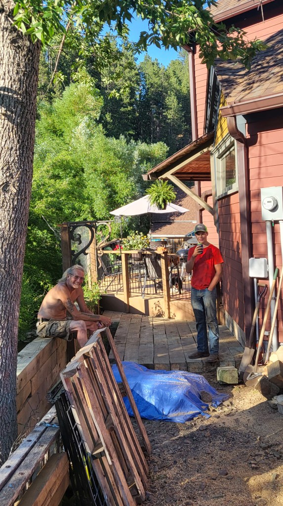 The “yard” had been a giant hole for many years, open to the unfinished foundation and a year-round access to the basement. We’ve heard from locals who used to party down there, out of the elements and away from the law. Once we closed and finished the foundation, and excavated for drainage, the yard was a dirt-rock-weed patch. Now two-thirds are covered by this glorious deck. We made quick work of unloading patio furniture and moving already existing stuff around… topped it off with our outdoor cooking station, popped a few pots of flowers here and there and WOW. Charles has a really beautiful outdoor kitchen/living room that overlooks our beautiful creek below.