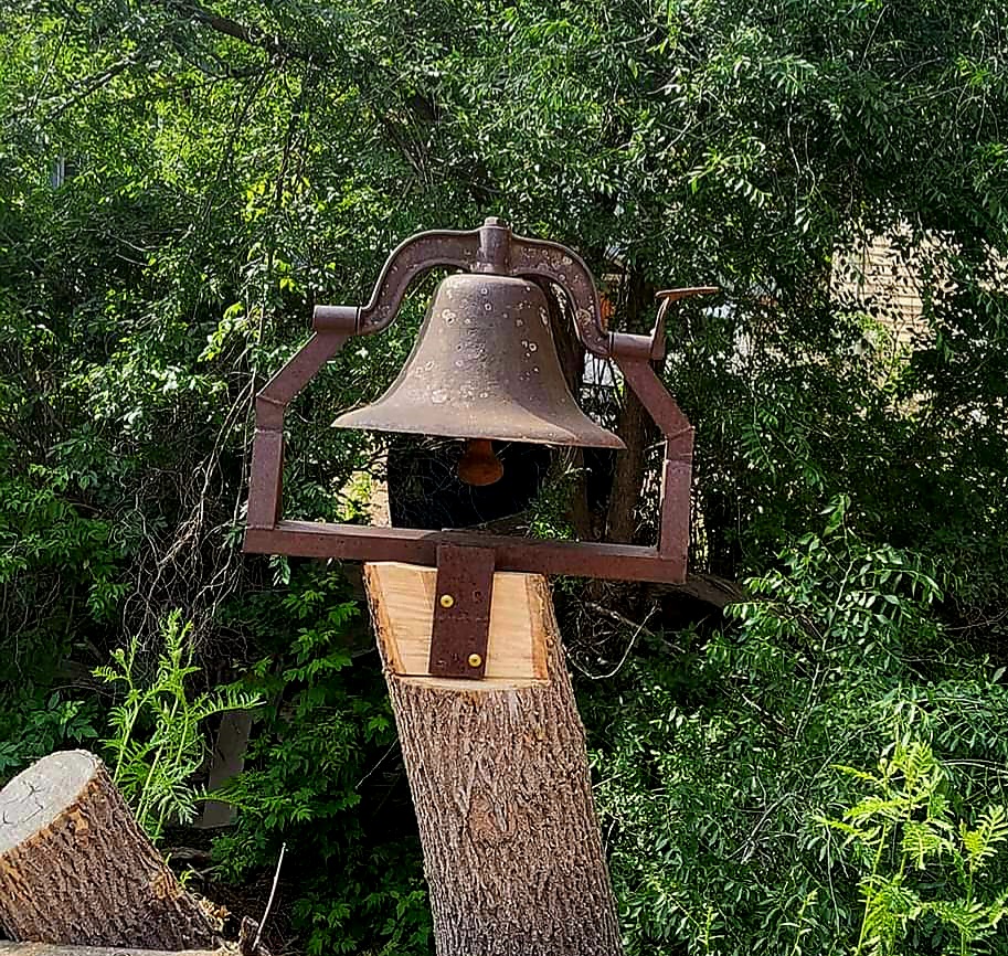 And we put the nephew to work with a chainsaw and more timbers and Jake built us a walkway area that is now level and completes the back of the house. Guests who come around the side of the house are greeted by this amazing approach, the trellis and the gate to the upper deck. To the left is the old Dorchester School bell, mounted to a fallen tree. To the right, guests are greeted by us.