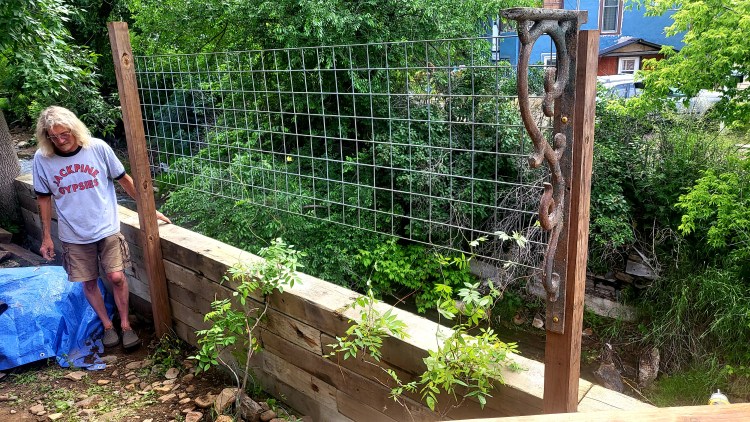 In the remaining uneven, unfinished space to the west, a timber wall was constructed for security, then topped off with a beautiful trellis. It now houses these really fantastic cast corbels that my sister-from-another-century Sarah found for me at a garage sale. They make the perfect frame for a pair of wisteria that I bought six years ago and never had a place to plant. Remarkably, they were still alive in their little plastic pots, and they are now transplanted and thriving in Deadwood.